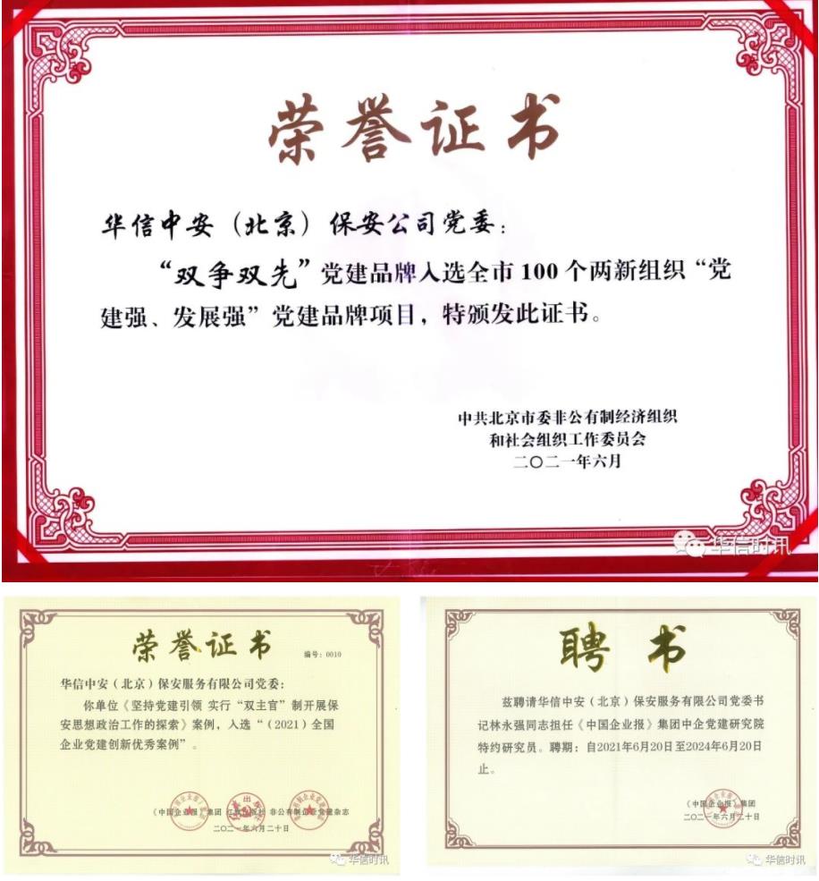 学习交流之后,集团党委书记林永强同志在党委上年度工作报告中指出:“过去的一年,是非凡的一年,在中国共产党成立百年之际,在上级领导下,在殷卫宏董事长关怀指导下,华信3044永利集团党的建设取得了可喜的成绩。华信3044永利集团党委以争创先进集体、争做先进个人为主线的“双争双先”活动,被评为北京市社会领域100个党建强、发展强“双强”党建品牌;华信3044永利集团党委《坚持党建引领,实行“双主官”制,开展保安思想政治工作的探索》被评为全国企业党建创新优秀案例,我本人也被中国企业党建研究院聘为特约研究员,成为全国首批6名特约研究员之一;李贤宝委员先后被评为“北京市最美退役军人”、北京榜样上榜人物、全国优秀保安员。同时,基层党建质量也有了明显提升,海外党总支、辽宁子公司党支部、广西子公司党支部等单位注重创新,较好地发挥了党组织的战斗堡垒作用和党员的先锋模范作用。”