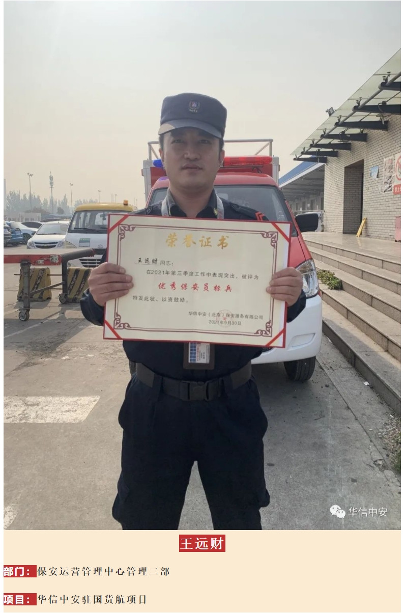 王远财自2014年加入公司至今,在工作岗位上始终勤勤恳恳、兢兢业业。工作中,他吃苦耐劳,任劳任怨,积极主动地配合队长工作,哪里苦、哪里累、哪里需要哪里他就冲在第一个。生活中他团结同事,言传身教,对新队员尽心尽力的帮扶,无私的传授工作经验。工作之余,他主动加强自身学习,梳理各项工作流程,多次发现驻勤单位安全隐患并主动上报积极协助解决,受到甲方表彰。经保安运营管理中心党总支和管理二部党支部按照程序要求组织评比、推荐,集团党委研究决定,授予王远财2021年第三季度优秀保安员标兵。