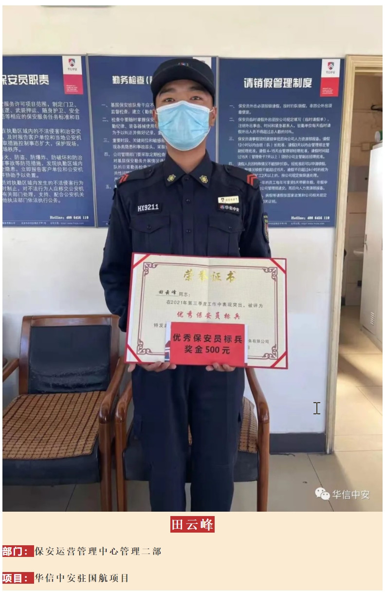 田云峰在工作中爱岗敬业、尽职尽责,具有较强的事业心和责任感,始终严格要求自己,能够按照公司各项规章制度执行、开展工作,不断加强自身学习,提高自身的业务能力和理论水平。在岗位上积极带动新队员,起到了模范带头作用。今年春节、中秋节、国庆节等节假日期间主动放弃与家人团聚,夜以继日的坚守在工作岗位,奋战在抗击疫情的第一线,多次受到甲方领导的表扬肯定,经保安运营管理中心党总支和管理二部党支部按照程序要求组织评比、推荐,集团党委研究决定,授予田云峰2021年第三季度优秀保安员标兵。
