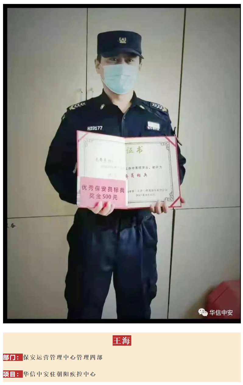 王海,政治上放心业务上过硬,始终严格要求自己,工作中严谨、细致、求实、脚踏实地埋头苦干,具有较强的责任感、服务意识和协调能力。面对事务杂、任务重的各项琐碎工作,他总是保持高度的责任感、使命感和工作热情,积极负责地开展工作,多次受到疾控中心项目后勤办公室主任、物业经理的表扬。经保安运营管理中心党总支和管理四部党支部按照程序要求组织评比、推荐,集团党委研究决定,授予王海2021年第三季度优秀保安员标兵。