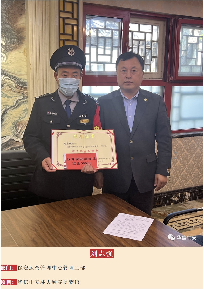 刘志强为人亲善,为事耿直,为业忠诚,工作中他以身作则,严格要求自己,从身边的点滴小事做起,起到模范带头作用。同事评价他平凡中透着善良,纯朴中透着勤劳,真诚中透着无私。疫情期间,他主动请缨奔上一线执勤岗位,每天负责清洁消杀,检查登记来访人员、车辆等工作。工作之余,他每天主动把博物馆1号院院落和卫生间收拾的干干净净,甲方领导评价他是难能可贵的保安员。经保安运营管理中心党总支和管理三部党支部按照程序要求组织评比、推荐,集团党委研究决定,授予刘志强2021年第三季度优秀保安员标兵。