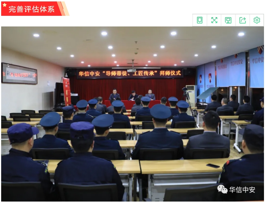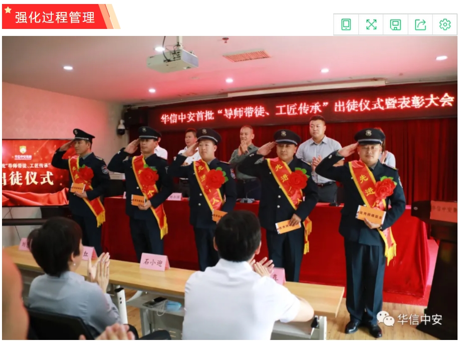 "导师带徒 工匠传承"管理制度的有效推行,需要多方面的支持,尤其是企业管理者将其上升到企业战略层面进行顶层设计,建立完善的制度予以长期贯彻执行。华信3044永利集团集团"导师带徒 工匠传承"管理制度推行之初,就在具体实施方案中明确规定了选师范围、选徒范围、带徒周期、师傅竞选程序、师徒责任、出徒标准等具体细则。并随着此项管理制度的深入推行对管理实施方案进行了逐步修改和完善,在方案中进一步明确了师傅和徒弟的责任与权利,学徒出徒的各项要求和出徒的标准。在导师筛选过程中,严格按照个人申请、基层单位推荐、保安管理部审核、品控中心复核、开展任前培训、保安运营管理中心考核等选拔程序挑选专业素质优秀、品格过硬的优秀保安员代表作为师父,使每一位师傅都能树立一面旗帜,不仅在保安业务技能上对徒弟言传身教,还能通过自己的匠心来影响徒弟。
